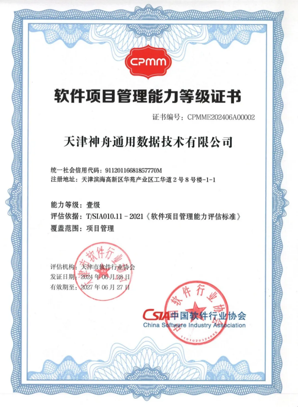經(jīng)過天津市軟件行業(yè)協(xié)會的受理和初評,并由中國軟件行業(yè)協(xié)會組織的專家團(tuán)隊進(jìn)行嚴(yán)格評審,神軟公司子公司天津神舟通用數(shù)據(jù)技術(shù)有限公司憑借優(yōu)秀的項目管理能力,榮獲了軟件項目管理能力評估(CPMM)一級證書。