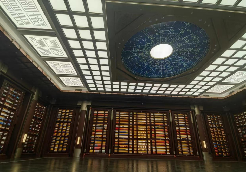 在主建筑文華堂,穹頂之上,取自宋代石刻天文圖的滿天星宿點綴其中,寓意中華文明如星空般浩瀚璀璨。環(huán)視四周,15組書柜、3萬余冊古今經(jīng)典匯成文山字海,彰顯厚重文化底蘊。