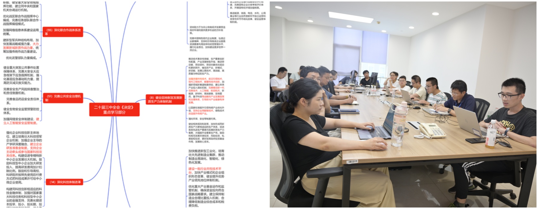 第九黨支部第一小組重點學習了“注重構建支持全面創新體制機制”,黨員同志們紛紛表示深刻體會了堅持守正創新的重要性,堅持守正創新,是我們在新時代推進各項事業發展的根本要求。在軟件研發過程中,在保證基本原則和規律的基礎上,要勇于探索新的技術、方法和業務模式,推出更好的產品服務更多的團隊,以滿足不斷變化的市場需求,為民族軟件的進步貢獻力量。第九黨支部第二小組通過學習《黨的二十屆三中全會 一圖讀懂》,觀看《學習貫徹黨的二十屆三中全會精神系列專訪|深刻領會進一步全面深化改革的主題》帶領黨員同志們深入學習會議精神,加強了對全面深化改革的理解,使黨員同志們把握會議的核心要義和實踐要求,從而在各自的工作崗位上更好地落實黨的方針政策,推動各項工作的高質量發展。
