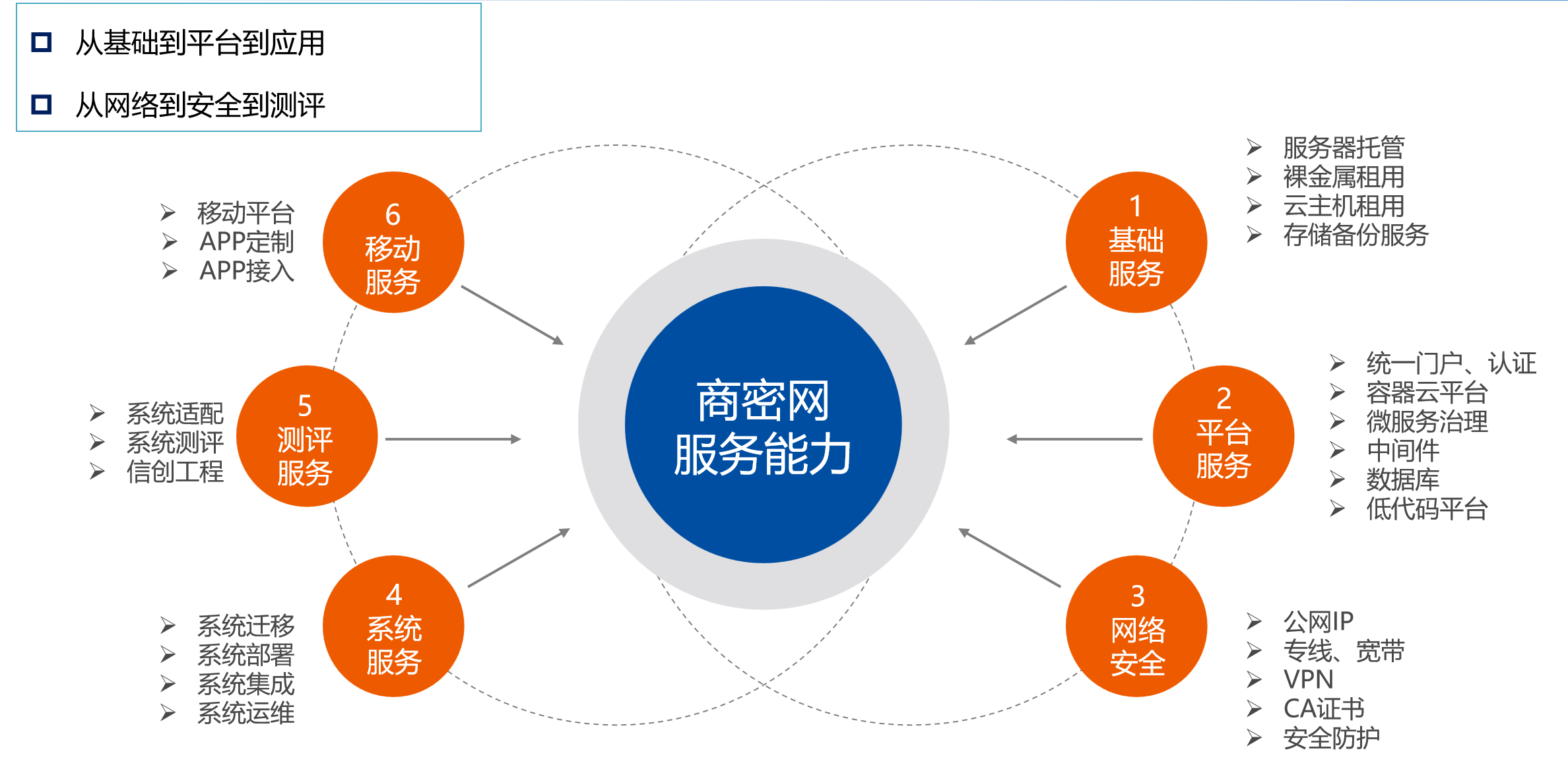商密網云數據中心建設及服務理念,貼合集團型企業經營管理、科研生產特點,實現全新信息技術與管控模式變革的深度融合,創新服務理念、優化資源配置、增強安全防控、降低運營成本,不僅能夠提供基礎、網絡、安全、云平臺、中間件、數據庫等基礎服務,隨著生態體系的不斷完善,也能夠提供軟件服務。